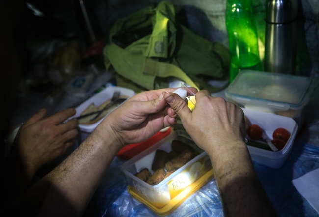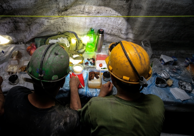 İlçeye bağlı bağlı Eynez Mahallesi'nde özel bir şirket tarafından işletilen maden ocağında çalışan işçiler, iftar vaktinin yaklaşmasıyla baretlerinin ışığının aydınlattığı karanlık dehlizde ahşap direk ve kalaslardan masalarını oluşturdu.