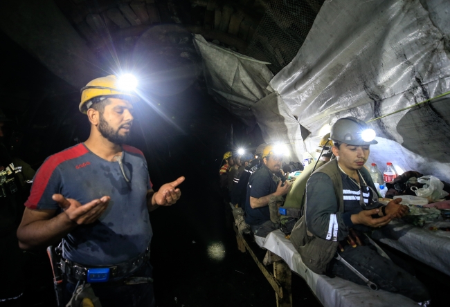 Yerin yüzlerce metre altındaki kömürlerin yeryüzüne çıkarılmasında başrolde olan madenciler, iftarını yaptıktan sonra dua edip, maden ocağındaki mesailerini sürdürdü.