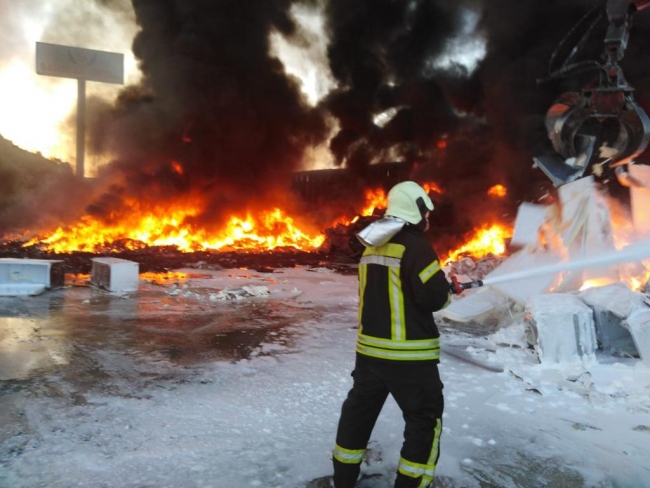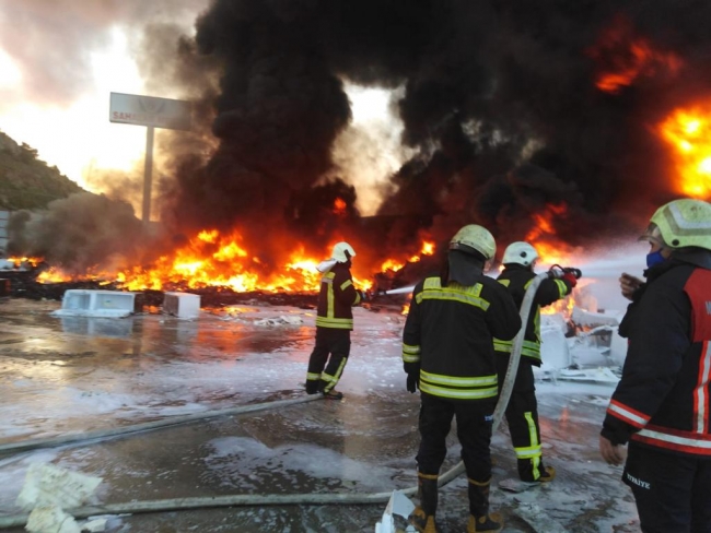 Manisa Menemen yolu üzerinde geri dönüşüm tesisinde akşam saatlerinde yangın çıktı.