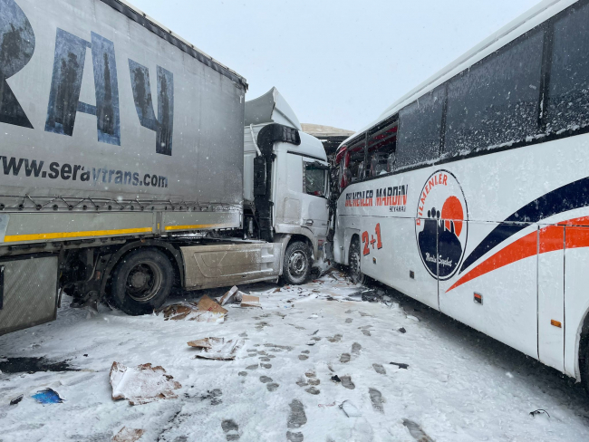 Kar yağışının etkili olduğu Kızıltepe-Nusaybin kara yolunun kırsal Eymirli Mahallesi mevkisinde, sürücülerinin kimliği ve plakaları henüz öğrenilemeyen 4 tır, 1 yolcu otobüsü, ticari araç ve 2 otomobilin karıştığı trafik kazası meydana geldi.