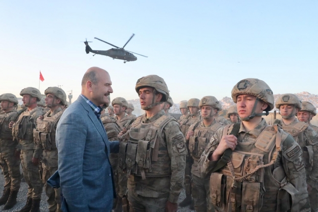 Bakan Soylu, "Bunu birlikte başaracağız ve bu milletin başından bu musibeti hep birlikte söküp atacağız. İsimlerinizi herkes bilmeyebilir ama biliniz ki isimleriniz hem milletimizin nezdinde hem de Cenabı Allah’ın katında mahfuzdur. Evlatlarınız Cenabı Allah’ın koruması ve gözetimi altında bu yaptığınız kahramanlıklarla birlikte olacaktır. Bu mücadeleyi, bu kahramanlığı aynı şekilde devam ettireceğiz. Nereye kadar giderse, oraya kadar gitmek bizim milletimize verdiğimiz söz ve bu topraklarda yaşamamız için namusumuzdur. Ne toprağımızı kimseyle paylaşırız ne de şurada oluşturduğumuz huzuru birisine bozdururuz. Bir taraftan işimizi iyi yapacağız, bir taraftan da Allah’ın ipine sımsıkı sarılacağız. Anneleriniz, babalarınız, evliyseniz eşleriniz çoluk çocuğunuz, akrabalarınız ve onların çerçevesinde bir büyük millet size dua etmektedir. Allah ayağınızı taştan esirgesin diye dua etmektedir. Burada bir tarih yazıyorsunuz ve bir büyük millet ve dünya buna şahitlik ediyor. Yolculuğumuza devam edeceğiz. Şu anda operasyonlarda bulunan bütün evlatlarımızı kahramanlarımızı, polisten askerimize, jandarmamıza korucumuza kadar herkesi muhafaza etsin. Bu bayramlar buralarda daha şenlikli olacak" dedi.