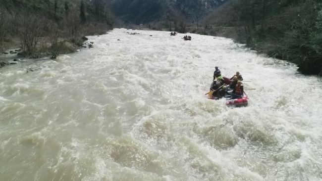 Doğa içinde debisi yüksek suda botlarıyla ilerleyen adrenalin tutkunları,13 kilometrelik parkurda hep birlikte heyecanlı anlar yaşadı.