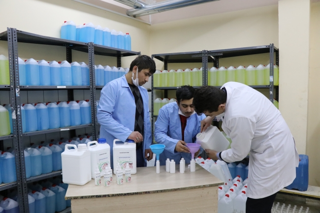 Okul müdürü Halis Karabulut, salgının başından itibaren yaklaşık 1000 ton el ve ortam dezenfektanı ürettiklerini söyledi.