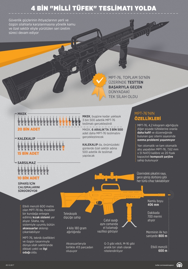 Farklı 42 NATO standardı kapsamında yapılan testleri hatasız geçen tek tüfek unvanını kazanan MPT-76'da geçen yıl seri üretim başladı. Bu kapsamda, güvenlik güçlerine geçen yıl 7 bin tüfeğin teslimatı yapıldı.