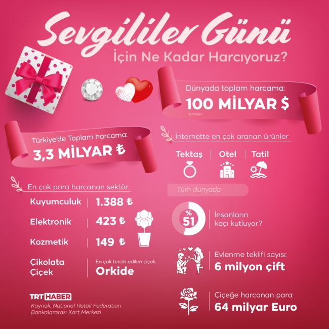 [Grafik: TRT Haber (Bedra Nur Aygün)]Sevgililer Günü'nün en kazanan sektörü kuyumculuk. En çok yüzük, kolye ve saat gibi şık eşyalar tercih ediliyor. Sadece ABD’de mücevherlere bu 14 Şubat’ta 4,3 milyar dolarlık bir harcama bekleniyor. En çok tercih edilen diğer hediyelerse sırasıyla elektronik eşyalar, kozmetik ürünler ve çikolata.