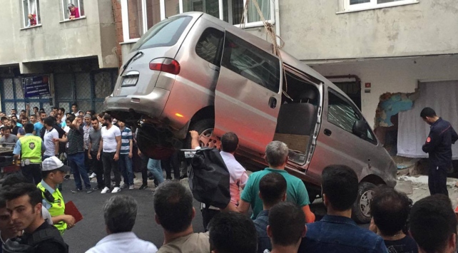 Önce sokakta oynayan çocuklara çarpan minibüs, ardından 4 katlı bir binanın giriş katındaki eve girdi.