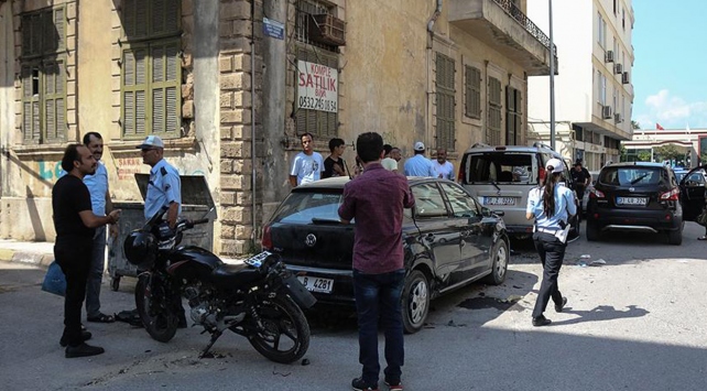 Hatay'ın İskenderun ilçesinde otomobilin çarptığı motosiklet sürücüsü, park halindeki başka bir aracın arka camından içeri girdi.
