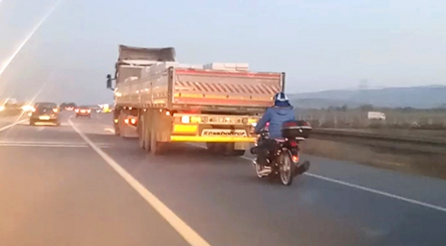 Yaklaşık 70 kilometre/saat hızda seyrederken, başka bir aracı sollayan beton mikseriyle birlikte de hareket ederek tehlikeli sürüşünü sürdüren motosikletli, bir müddet sonra ise başka bir kamyonun arkasından aynı şekilde yolculuk ederken görüldü.