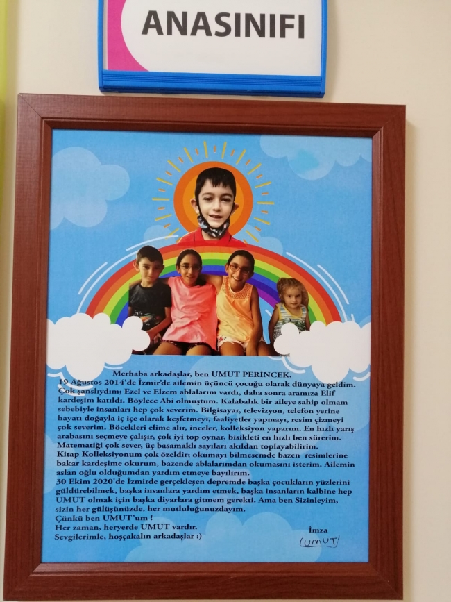Enkazdan çıkarılan 3 çocukları ile yeni bir hayat kurmaya çalışan Perinçek çiftinin kaleme aldığı öz geçmiş "Umut Perinçek" ana sınıfının kapısına asıldı.