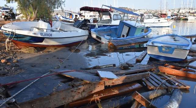 Öte yandan depremin ardından Bodrum'un Gümbet Mahallesi'nde yükselen deniz, çok sayıda tekne ve araçta hasara yol açtı. Yükselen sular nedeniyle balıkçı barınağında bulunan çok sayıda tekne karaya oturdu, bazıları da birbirlerine çarparak yan yattı.