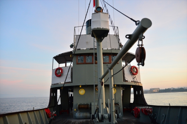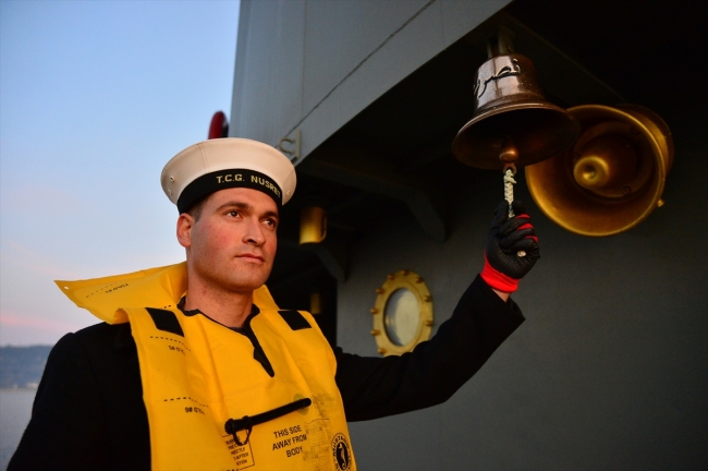 Çanakkale Deniz Müzesi Komutanlığı Yüzer İskelesi'nde demirli bulunan "TCG Nusret (N-16)", sabah saat 07.15'te buradan avara edilerek 104 yıl önce mayınlarını döktüğü rotada ilerledi.