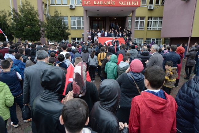 "Şehitler ölmez vatan bölünmez" sloganı atan öğrenciler, şehitler için dua etti. Her okuldan birer temsilciyi Valilik Toplantı Salonu'nda ağırlayan Karabük Valisi Çeber, bağış makbuzlarını teslim aldı.