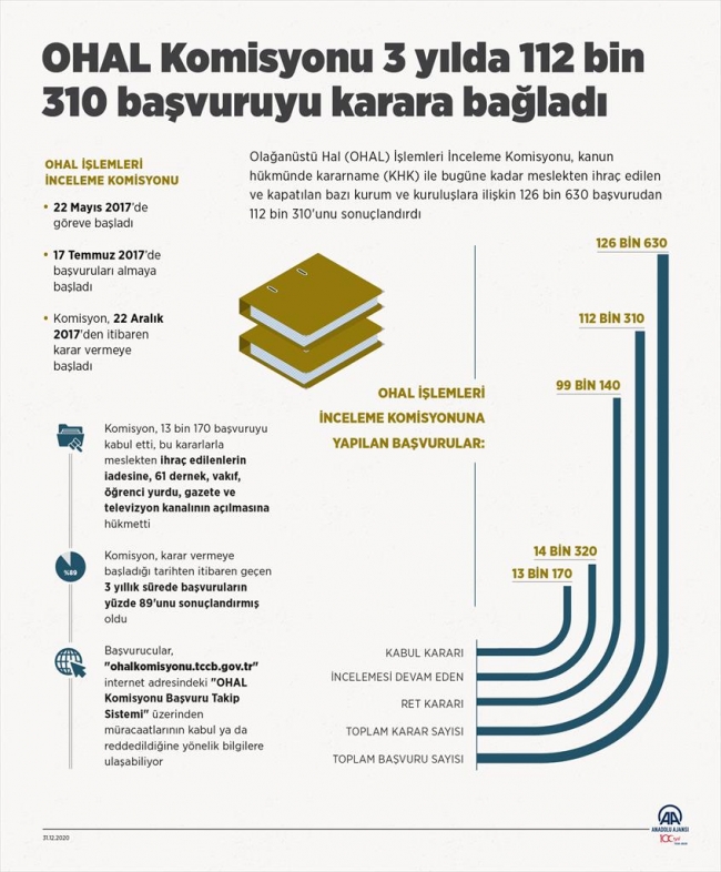 Olağanüstü Hal (OHAL) İşlemleri İnceleme Komisyonundan yapılan açıklamaya göre, meslekten ihraç edilenler, bursu kesilen öğrenciler, rütbeleri alınan emekli güvenlik personeli, kapatılan kurum ile kuruluşlara ilişkin başvurulara bakmak üzere kurulan OHAL İşlemleri İnceleme Komisyonuna 126 bin 630 müracaat gerçekleştirildi.