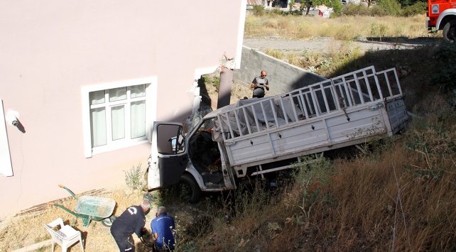 Sivas'ın Suşehri ilçesinde freni tutmayan kamyonet, bahçe duvarından aşağı düşüp bir eve çarparak durabildi.