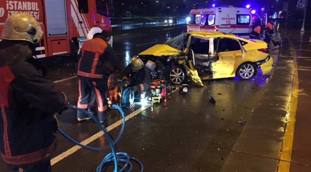 Çarpmanın etkisiyle taksi içerisinde sıkışan sürücü Aktaş ile Hatice T, itfaiye ekiplerince çıkartılarak ambulansla hastaneye kaldırıldı.