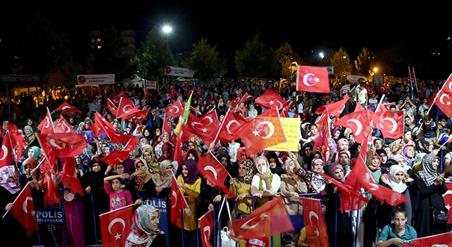 PKK'lı teröristlerin saldırıları nedeniyle ilçeden göç ettikten sonra ev kiralayan ya da yakınlarının yanında kalan Sur halkı, yaşadıkları acıları ve içinde bulundukları zor durumu geride bırakarak FETÖ'nün darbe girişimine karşı Kayapınar ilçesindeki Park Orman'da demokrasi nöbetine katılıyor.