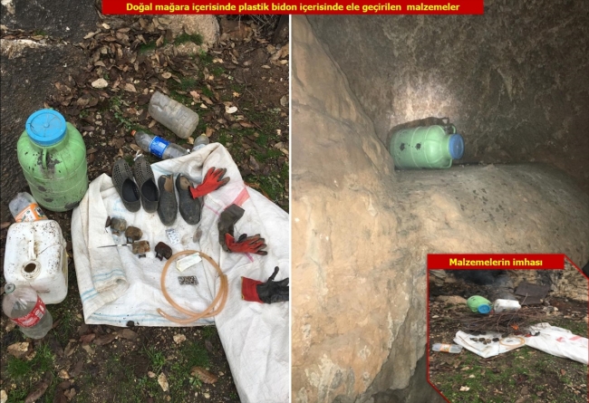 Operasyonda, teröristlerce kullanılan 5 kış sığınağı, biri 15 bölümlü (mezar odalı şeklinde) olmak üzere 5 doğal mağara, biri 10 kişinin barınabileceği büyüklükte olmak üzere 2 doğal kaya kovuğunun tespit edilerek kullanılamaz hale getirildiği kaydedilen açıklamada, sığınaklar, toprağa gömülü vaziyetteki jelikan bidonlar içerisinde ve arazi aramasında 4 el yapımı patlayıcı düzeneği, el bombası, 60 kilogram amonyun nitrat, el dürbünü, 2 küçük tüp, kamp tüpü, 2 akü, 5 küçük pil, şemsiye, 11 terörist kıyafeti, 3 çift mekap ayakkabı, 2 çift spor ayakkabı, 2 palaska ile gıda, giyim, yaşam malzemeleri ve çok sayıda örgütsel döküman ele geçirildi.