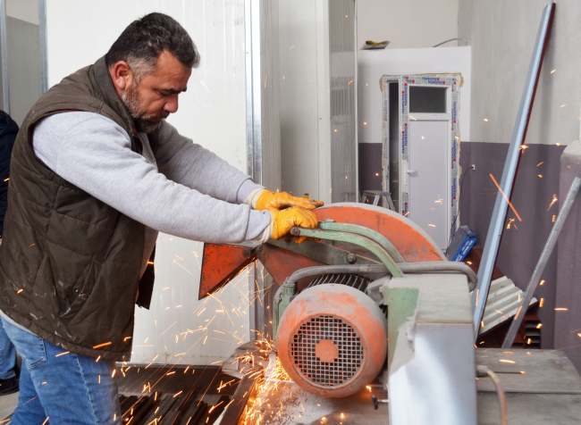 Küçük Sanayi Sitesi'ndeki atölyelerinde resmi kurum, sivil toplum kuruluşları ve hayırseverlerden gelen talepler doğrultusunda yoğun üretim yapan üreticiler, imal ettikleri prefabrik ve konteyner evleri deprem bölgesine ulaştırıyor.