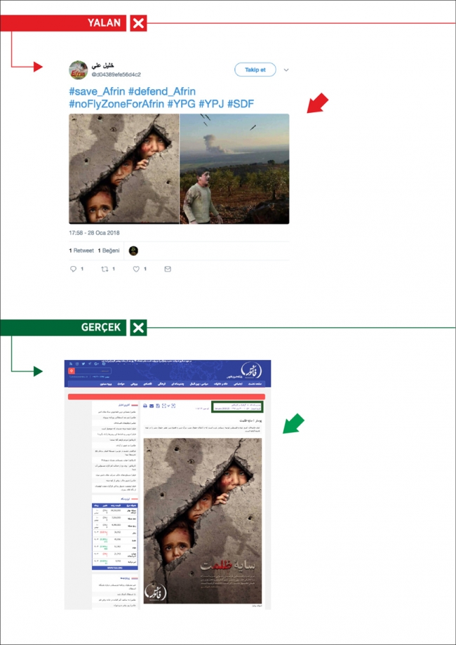 Doğu Gutalı çocukları Afrinli gibi gösteren terör destekçisi hesaplar, AA İstanbul Photo Awards 2016'da birinci olan fotoğrafı da Afrin'de çekilmiş gibi paylaşmış, Şırnak'ta 2007'de şehit olan korucu ve sivillerin cenaze töreninine ilişkin fotoğrafı ise "Afrin'de Türk askerleri öldürüldü" yalanıyla servis etmişti.