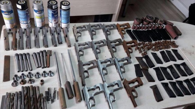 Ekiplerin evde ve çevresinde yaptığı aramada, 16 silah gövdesi, 11 sürgü üst kapağı, 10 namlu, 10 şarjör, 24 kabza kapağı, 37 tabanca yapımında kullanılan namlu altı demir malzeme, 10 namlu eklentisi demir parça, 3 eğe, 23 çeşitli çaplarda matkap ucu, 5 sprey boya, 24 çeşitli ebatlarda zımpara, 2 ortası delik demir parçası, bir tetik ve horoz aksamı, 5 silahın horoz kısmına ait demir parçaları, 7 şarjör alt kapağı, iki 9 mm ve iki 7,65 mm tabanca mermisi ele geçirildi.