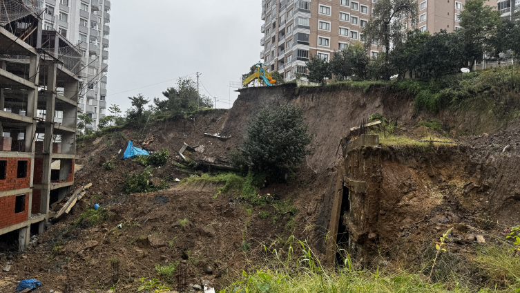 Kentte dün gece saatlerinden itibaren etkili olan şiddetli yağış nedeniyle Fener Mahallesi Yağmur Sokak'taki Ceylan Saray Sitesi'nin ön kısmındaki toprak kaydı.