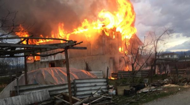 Samanlık bir anda alev topuna dönerken itfaiyeye haber verildi. Vatandaşlar ahırda bulunan 6 büyükbaş hayvanı dışarı çıkartarak kurtardı.