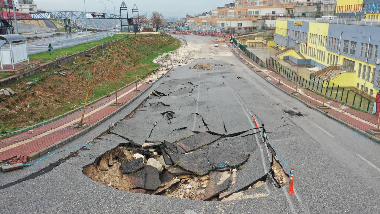 Yaklaşık 5 metre derinliğinde çukur oluşan, asfaltında da yarıklar görülen yol, çevresine güvenlik şeridi çekilerek trafiğe kapatıldı.