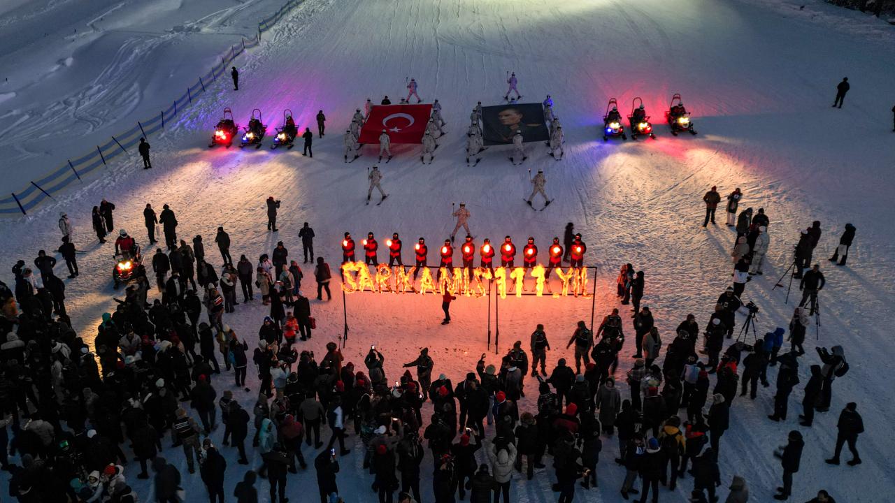 Sarıkamış Kayak Merkezi'nde düzenlenen etkinlikte, Çanakkale'deki 57. Alaya ithafen Sarıkamış'ta konuşlanan 57. Komando Taburu'nda görevli komandolar ve JAK timleri, ellerinde Türk bayrakları ve Atatürk posterleri taşıyarak meşalelerle zirveden indi.