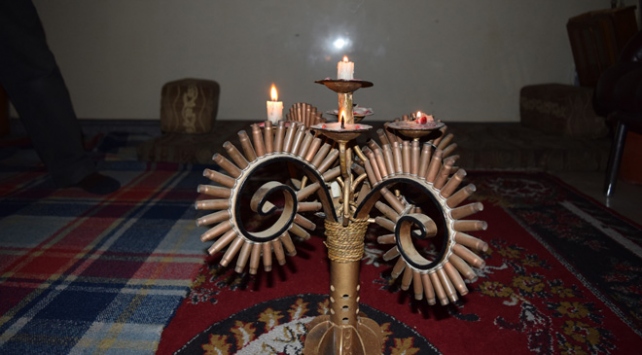 Kullanılan savaş mühimmatından şamdan ve avize de yaptığını dile getiren Ramazan, ''İşe başlamadan önce unutmamak için projemi kağıda çiziyorum. Hurma ağacını yapmadan önce yaprak kısımlarını yaptım. Ölüm makinelerinden sanat yapıyorum. Çocuklar da artık mühimmatla oynayarak kendilerine göre şekiller yapıyor." dedi.