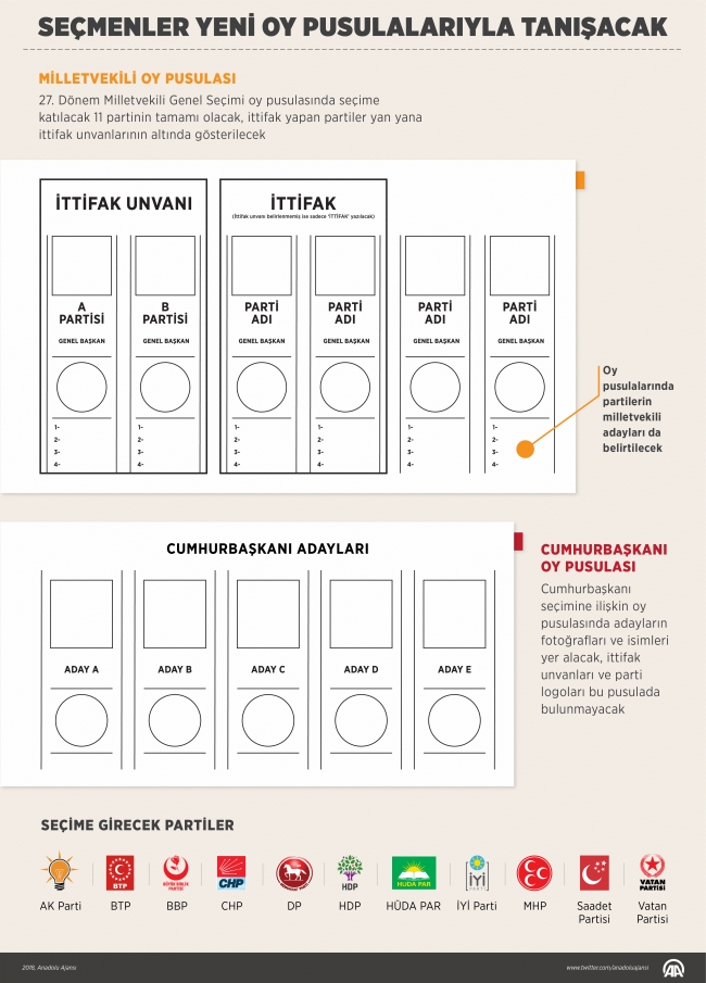 Bu pusulada Yüksek Seçim Kurulunun (YSK) kararıyla seçimlerine girmelerine karar verilen AK Parti, BTP, BBP, CHP, DP, HDP, İYİ Parti, MHP, Saadet Partisi, Vatan Partisi ile HÜDA PAR bulunacak.