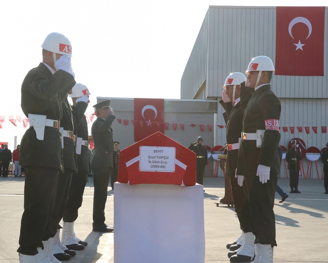 Barış Pınarı Harekatı bölgesinde tespit edilen el yapımı patlayıcıya müdahale sırasında şehit düşen İstihkam Uzman Çavuş Suat Topçu'nun cenazesi, Şanlıurfa GAP Havalimanı'nda düzenlenen törenle memleketi Osmaniye'ye uğurlandı.