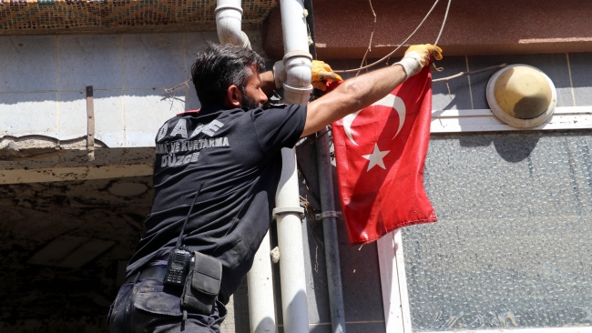 Ekip üyeleri ve Aksu, çamurun içinden çıkardıkları bayrağı yıkayıp, öperek bir dükkanın üst kısmına astı.
