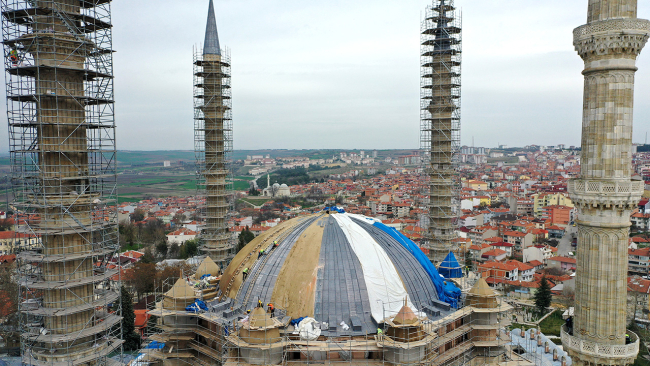 Kubbelerin Horasan sıva çalışmaları, minare onarımları, ana kubbe kurşun kaplama imalatları, ahşap pencere ve kapıların bakım onarımları devam ediyor.