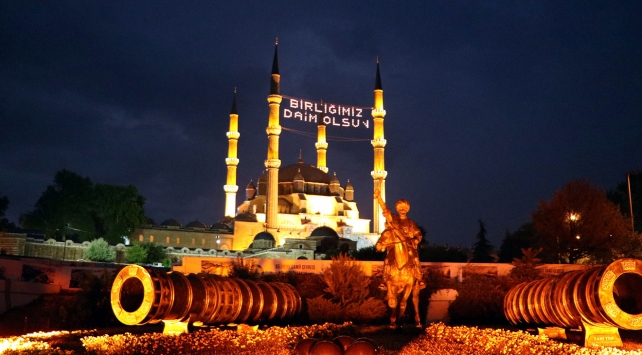 Mimar Sinan'ın ustalık eseri Selimiye Camisi'ne, 15 Temmuz Demokrasi ve Milli Birlik Günü dolayısıyla "Birliğimiz Daim Olsun" yazılı mahya asıldı.