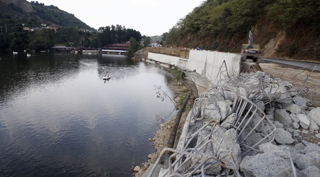 Trabzon'un Akçaabat ilçesi Sera Deresi Vadisi'nde 1950'deki heyelanın ardından oluşan Sera Gölü'nde yapılan "perde beton"lar yıkılıyor.