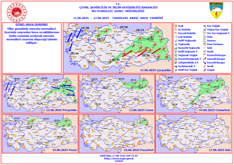 Meteoroloji Genel Müdürlüğü tarafından yapılan son tahminlere göre, sıcak havanın etkisinde bulunan Türkiye'de hafta sonu sıcaklıklar biraz azalarak mevsim normallerine dönecek.