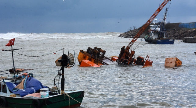Saatteki hızı 60 kilometreyi bulan fırtına nedeniyle Düzce'deki Akçakoca Limanı içerisinde bulunan, yatay mahmuz çalışması yapan sondaj platformuyla bir balıkçı teknesi battı.