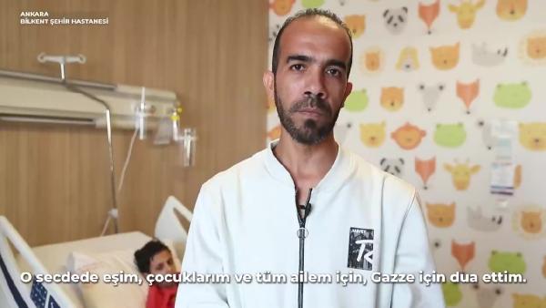 Secde etmemin sebeplerinden biri, oğlum ile birlikte Türkiye'ye ulaşmamız oldu. Şükür bir sorun çıkmadı. Secde sebebimin ikincisi, Allah eşimi, çocuklarımı, ailemi ve Gazze halkını koruyor. Elhamdilillah Türkiye'ye ulaştık. Hükümet bizimle ilgileniyor. Allah'a şükür ettim. Ülkemizden çıkıp başka bir ülkeye girmiş gibi hissetmiyoruz. Türkiye bizim ikinci ülkemiz. Yanımızda oldukları için Cumhurbaşkanı Recep Tayyip Erdoğan'a şükranlarımı sunuyorum. Türk halkına teşekkür ediyorum. Dilerim desteklerini devam ettirirler ve yanımızda olurlar. Hastalarımızla ilgileniyorlar. İnşallah iyileştikten sonra savaştan sonra ülkemize geri döneceğiz. Sayın Cumhurbaşkanı'na, Sağlık Bakanı'na ve tüm Türk halkına teşekkür ederim. Umarım bizi desteklemeye devam ederler.