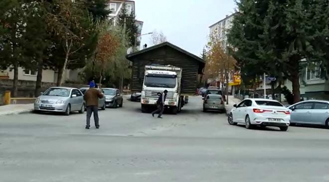 Ahşap prefabrik evi kamyonun kasasına yükleyen sürücü, çevredekiler tarafından cep telefonu kamerasıyla görüntülendi. Mahallelinin fotoğrafını çektiği kamyonun sürücüsünün evi, bağ evleri bölgesine götürdüğü belirlendi.