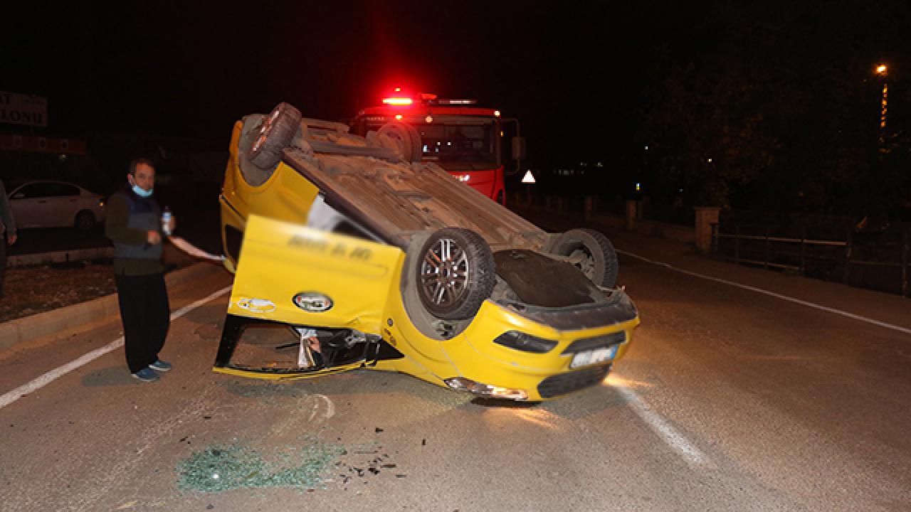 Çarpmanın ektisiyle kaldırıma vuran taksi ardından takla atarak ters devrildi.