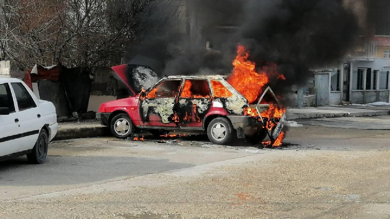 Bağlık Mahallesi Tevfik Fikret Caddesi'nde park halindeki otomobil, sürücüsü Rasim Üzgün'ün kontak anahtarını çevirmesiyle alev aldı.