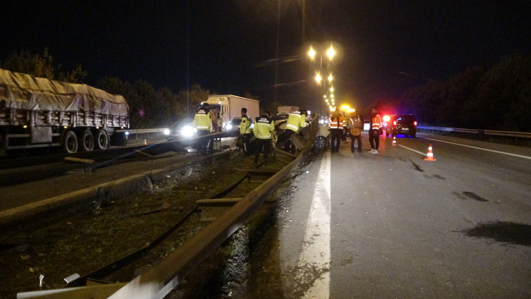 TEM Otoyolu'nun İzmit ilçesi Alikahya mevkiinde akşam saatlerinde Ankara istikametine giden T.Ş. yönetimindeki otomobil, sürücüsünün kontrolünden çıkarak bariyere çarptı. Ardından otomobil, refüjdeki iki bariyer arasında sıkıştı.