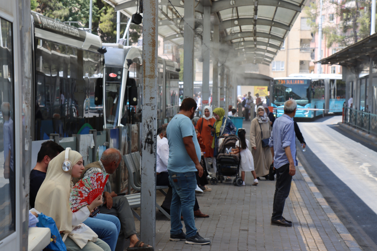 [Fotoğraf: AA]Şanlıurfa Büyükşehir Belediyesi otobüslerinin toplanma merkezlerinde bekleyen vatandaşlar ise soğuk buharlı su püskürtme sistemiyle serinliyor.