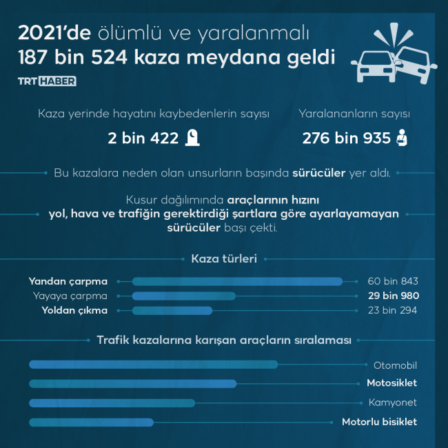 Emniyet Genel Müdürlüğü Trafik Başkanlığı verilerinden derlediği bilgiye göre, 2021'de 187 bin 524 ölümlü ve yaralanmalı trafik kazası meydana geldi. Bu kazalarda 2 bin 422 vatandaş kaza yerinde hayatını kaybederken 276 bin 935 kişi ise yaralandı. Kazaların 147 bin 331'i yerleşim yeri sınırlarında, 40 bin 193'ü ise yerleşim yeri dışında gerçekleşti.