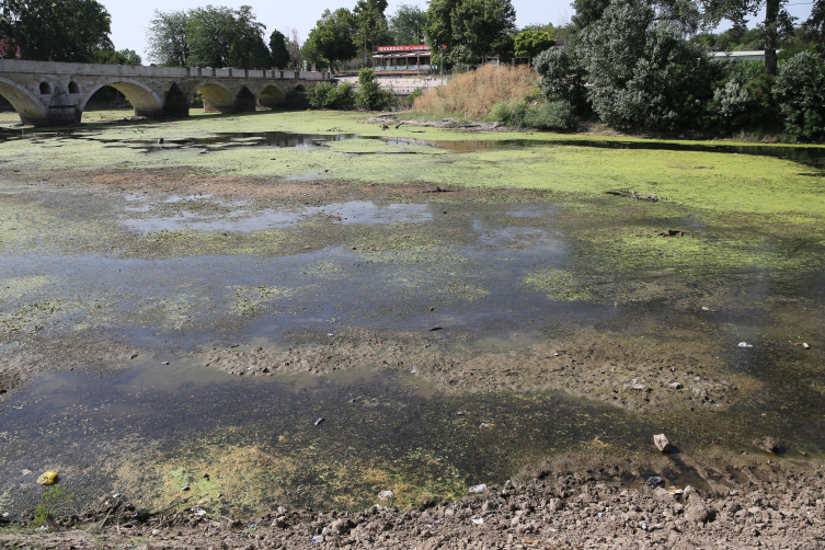 Nehrin bu bölümlerinde yüzeyi bitki ve yosunlar kapladı, yer yer balçıklar görülüyor. Su seviyesinin azalmasıyla nehre atılan çöpler gün yüzüne çıktı.