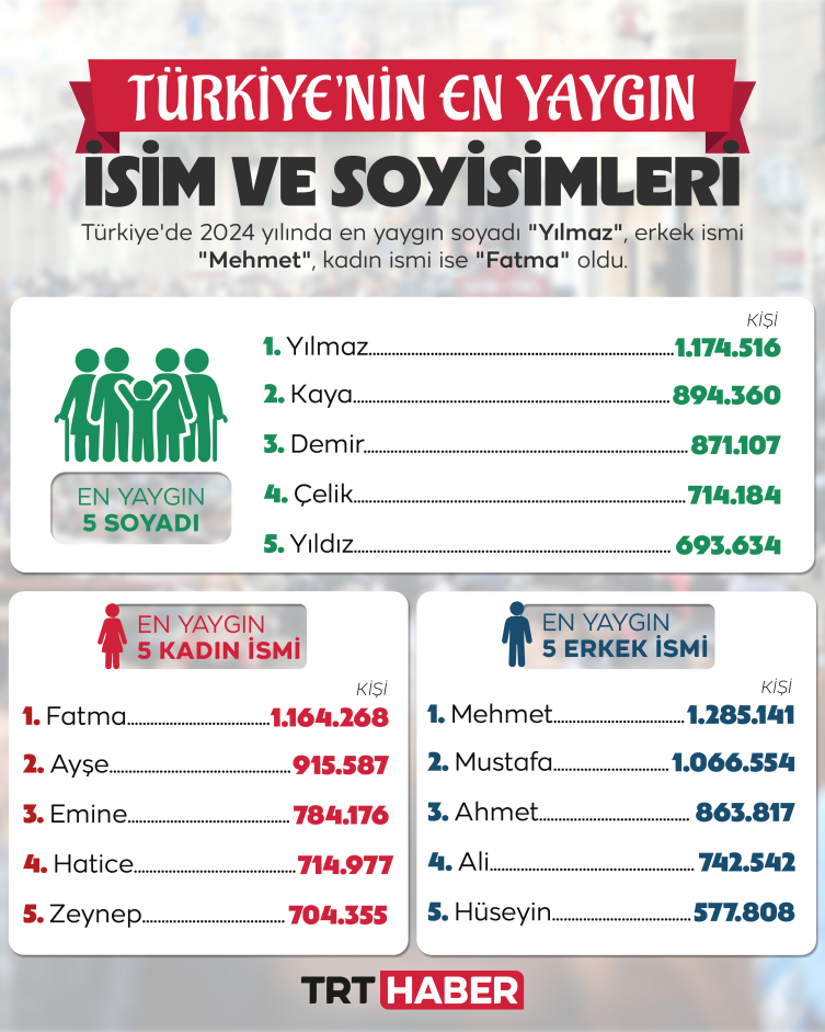 Türkiye genelinde en çok yaygın olan erkek isimlerine bakıldığında, "Mehmet" ismi 1 milyon 285 bin 141 kişiyle listenin başında yer aldı. Onu, 1 milyon 66 bin 554 kişiyle Mustafa ve 863 bin 817 kişiyle "Ahmet" takip etti.