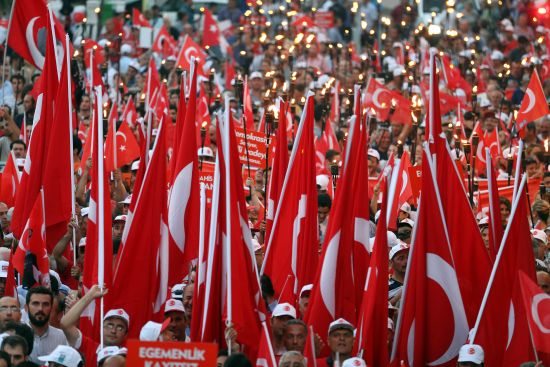 Demokrasi Meydanı'nda toplanan on binlerce kişi, Türk bayrakları taşıdı, "Dik dur eğilme, bu millet seninle", "Darbeye karşı omuz omuza" sloganları attı.