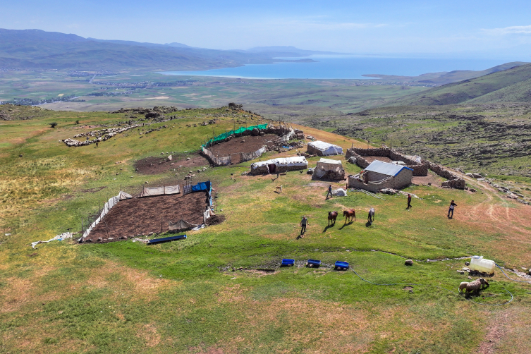 Yılın yarısına yakınını Van Gölü'ne hakim noktadaki yaylada geçiren Vanlı, günde iki kez sağdığı koyunlarından elde ettiği yaklaşık 600 kilogram sütü peynir ve yoğurt yaparak satıyor.