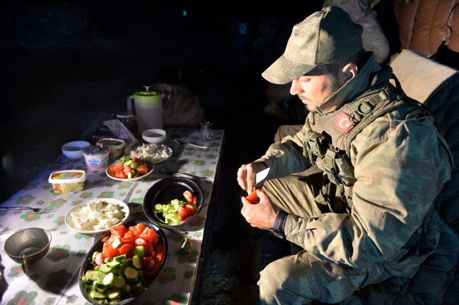 Ramazanın ilk sahurunu üs bölgesinde sırayla yapan korucular, vatanın bekası ve vatandaşların huzuru için 7 gün 24 saat nöbet tutuyor.