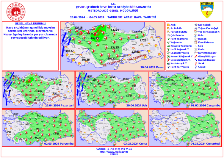 Pazartesi ve salı günü rüzgarın Marmara'nın batısı ile Ege'nin kıyı kesimlerinde kuzeyli yönlerden kuvvetli yer yer fırtına şeklinde eseceği öngörülüyor. Pazartesi günü ayrıca İç Anadolu'nun güneyi, Akdeniz ile Güneydoğu Anadolu'da toz taşınımı hadisesi görülecek.